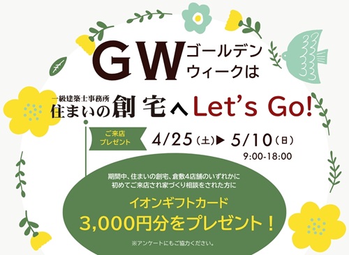 - 4/25㊏より3会場にて完成見学会開催。平屋、ドッグラン、キャットウォークなど見所いっぱい。