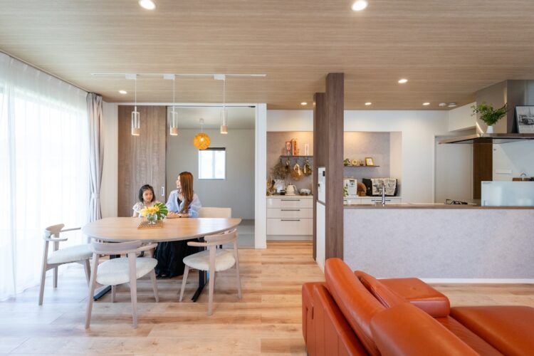 明るくゆったりとしたリビングです。陽の光をたくさん入れたかったので、南側と西側は掃き出し窓にし、明るい空間にしました。造作洗面もイメージをお伝えし、アドバイスをいただきながら出来上がったお気に入りの空間でもあります -