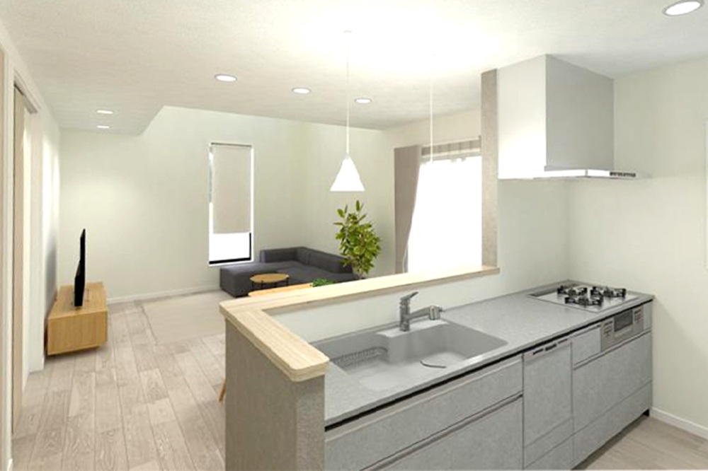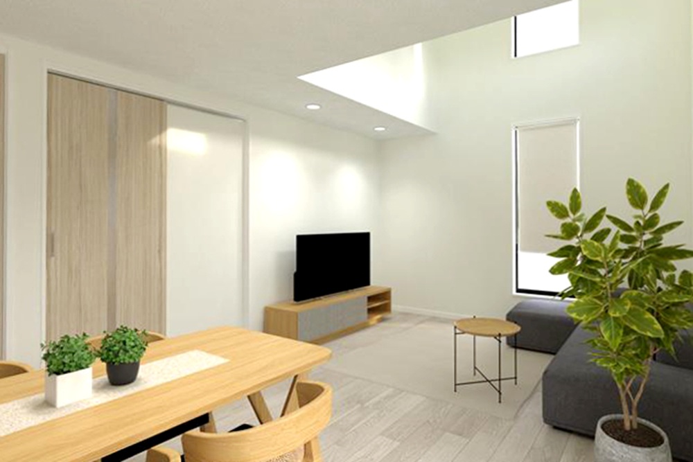 分譲地全体の街並みを意識した外観にしています。リビングへの採光を取り入れる為、吹抜を設けました。その為、リビングの床レベルの窓は少なくしており、外からの目線を切っています。また脱衣室を広く取り、部屋干し+ガス衣類乾燥機『乾太くん』で日々の洗濯はバッチリです。