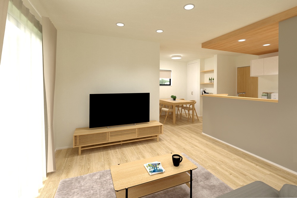 LDKをさりげなく空間分けしています。飾り棚に好きな雑貨を飾って自分好みに楽しんで頂ければと思います。独立のWICは色んな物の収納に使え重宝すると思います。