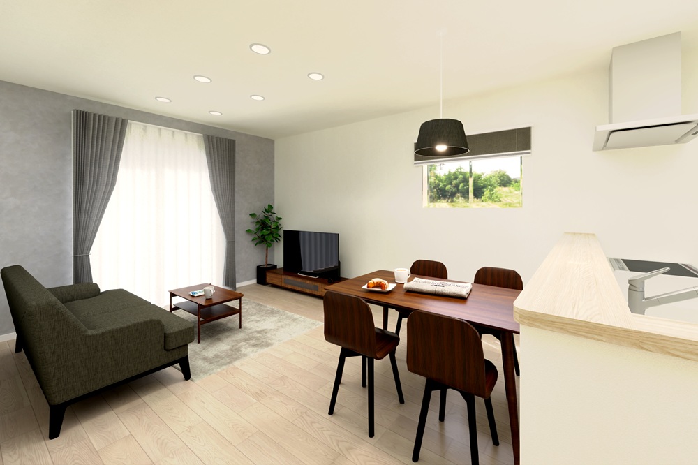ダイニングに取り入れたペンダントライトのシルバーグレーをテーマカラーにコーディネートしました。カーテンにグレーを取り入れスタイリッシュな空間に仕上げました。