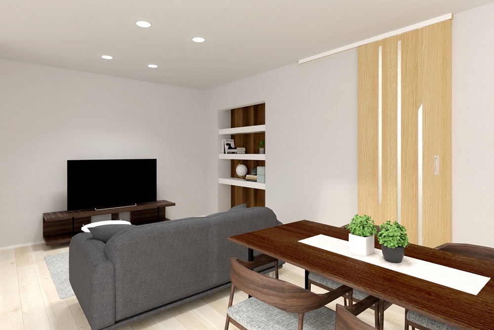 下がり天井とキッチンの扉色を合わせて繫がりを持たせ、まとまりのある空間に仕上げています。外壁の木を家具にも取り入れ、ナチュラルな空間に仕上げていますので穏やかに過ごしていただけると思います。