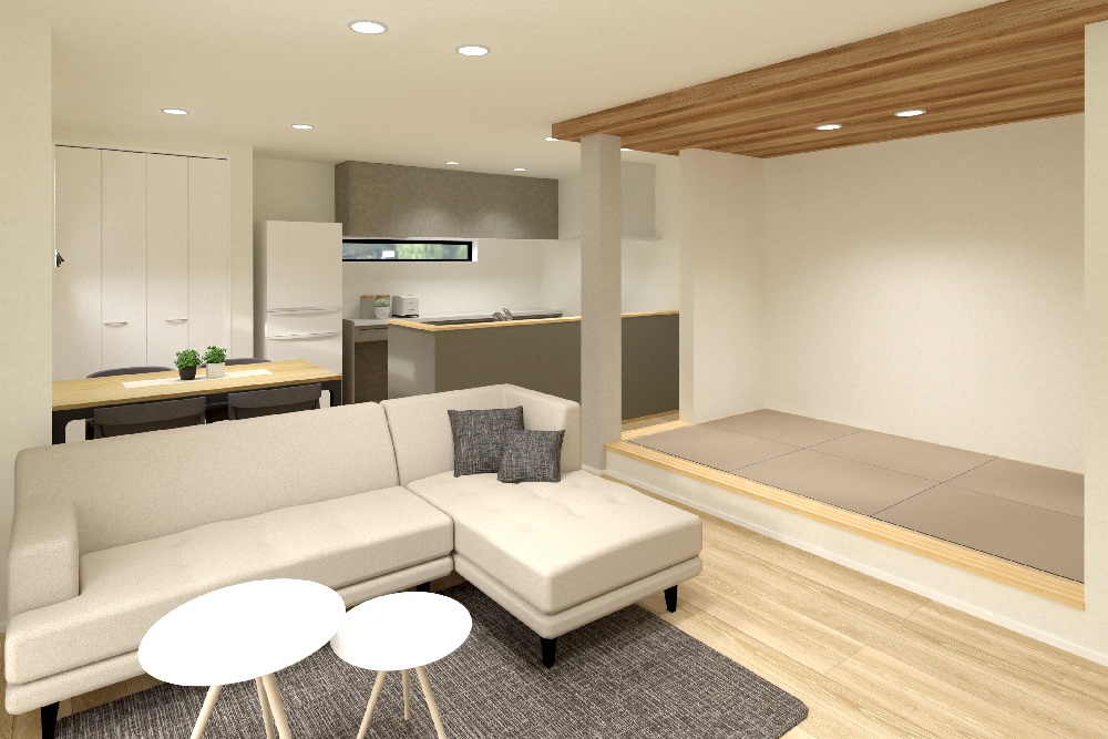 外壁の木目を室内のタタミコーナーにも取り入れました。全体はグレーでまとめ、シンプルにスッキリと仕上げていますが、クロスやフロアーの木目で温かみは残した仕上げにしています。